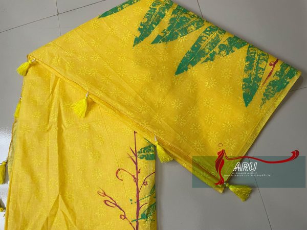 নরম Block Printed Saree, যেখানে ফুটিয়ে তোলা হয়েছে আম পাতার নকশা। এর পাশাপাশি পুরো শাড়িজুড়ে তারার ফুলের ছড়ানো ডিজাইন, যা চোখ ধাঁধানো সৌন্দর্য এনে দিয়েছে। নিখুঁত কালার কম্বিনেশনের সাথে ম্যাচিং টার্সেল, যা শাড়িটিকে আরও আকর্ষণীয় করে তুলেছে।